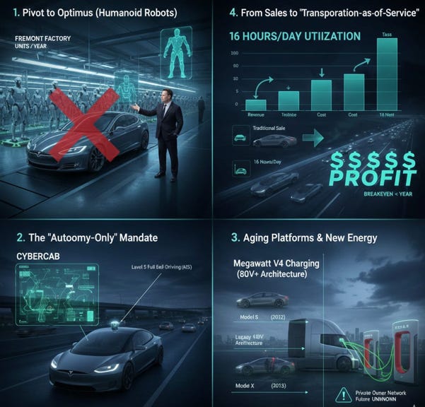 Thanks for writing this, it clarifies a lot. Your analysis perfectly articulates the strategic imperative behind Tesla's shift from automotive to a robotics and AI-centric identity, which is a fascinating, if brutal, market evolution. It's completely logical that aging platforms and the significant demands of AI5 for massive neural networks would render older models like the S and X obsolete, freeing up resources for future inovation.